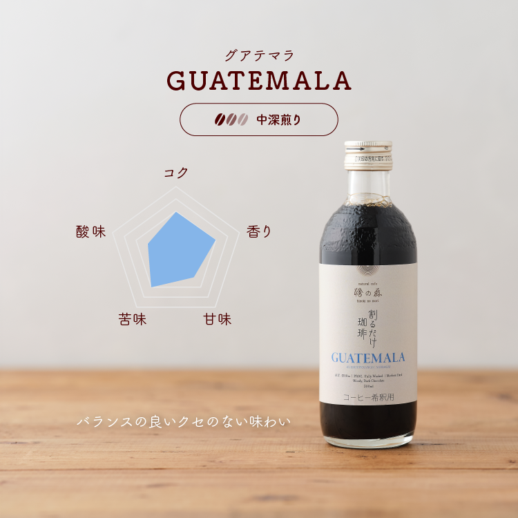 グァテマラ ウエウエテナンゴ地区の恵まれた自然環境から作り出される完熟したコーヒー豆を使用したエスプレッソベース。